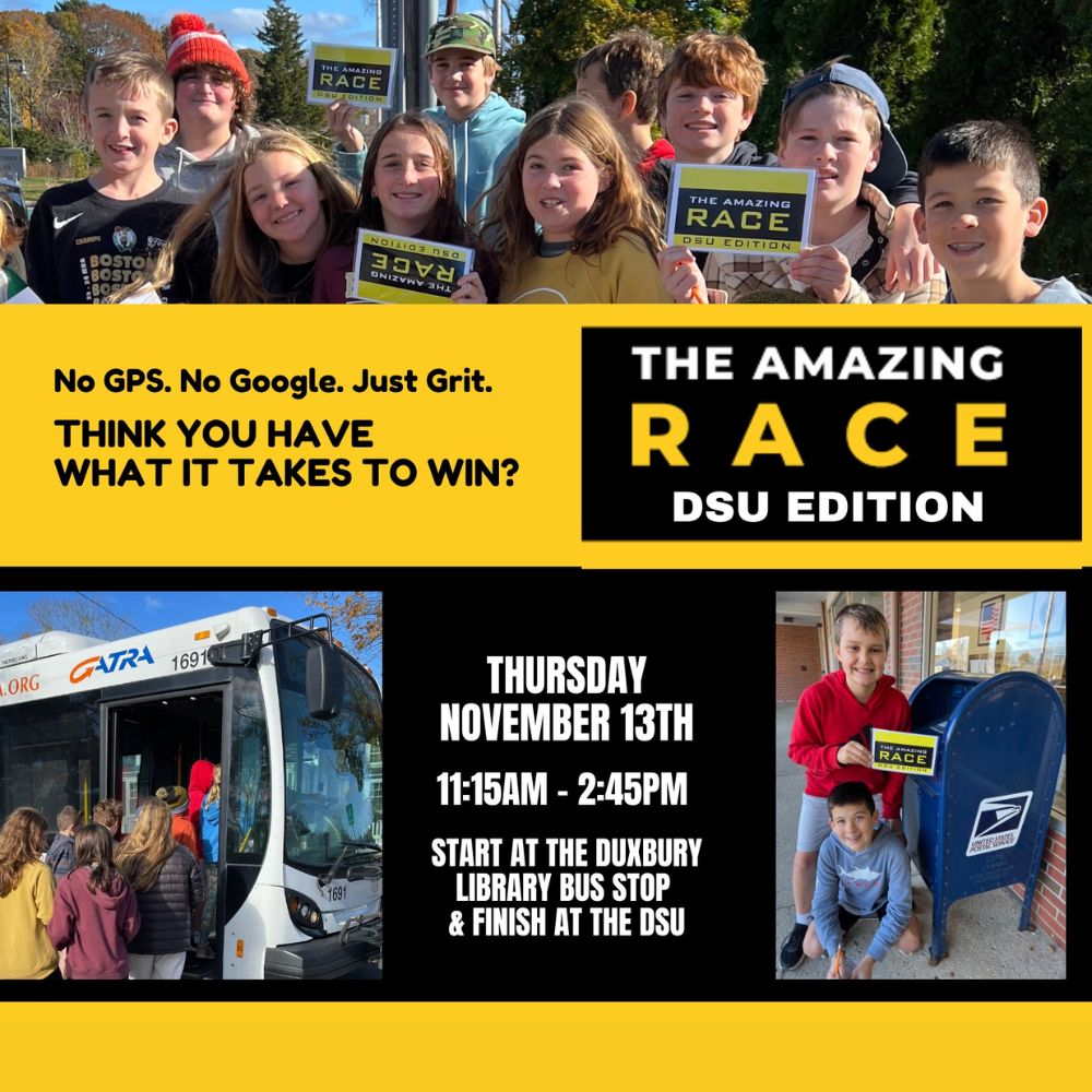No GPS. No Google. Just grit. DMS teams race across Duxbury solving clues and earning points—Nov 13, 11:15 AM–2:45 PM. Start at the Library Bus Stop, finish at DSU. $50 prize. Register today.