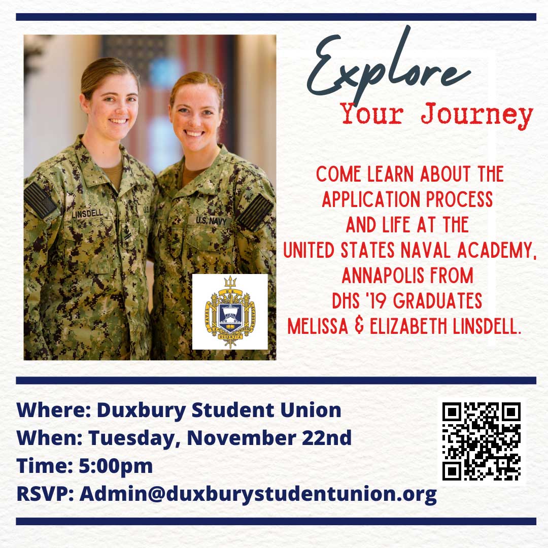 Join us at DSU on Tuesday Nov. 22nd at to learn about the application process and life at the United States Naval Academy, Annapolis from Duxbury High School ’19 graduates Melissa and Elizabeth Linsdell.